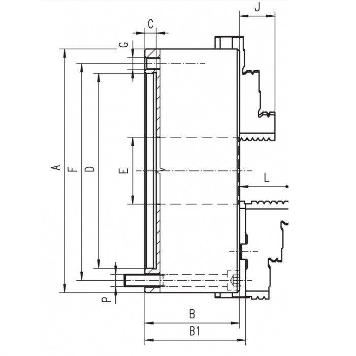Корпус чугунный, цилиндрическое крепление (DIN 6350). С сборными кулачками. Со сквозными отверстиями. Отшлифованные рабочие поверхности.