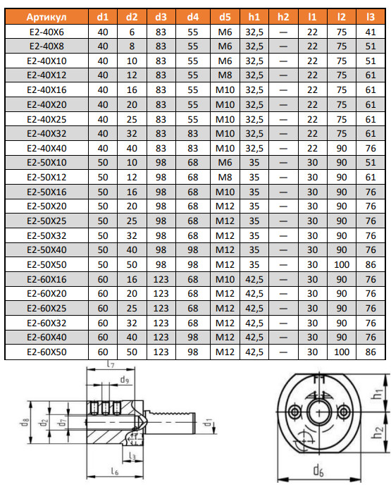 Резцедержатели тип E2 используются для фиксации резцов расточных, а так же для фиксации другого осевого инструмента, c внутренней подачей СОЖ. Фиксация резца с помощью винтов в корпусе резцедержателя. При помощи переходных втулок можно расширишть возможности станка, фиксируя в держателе иснтрумент разного диаметра.