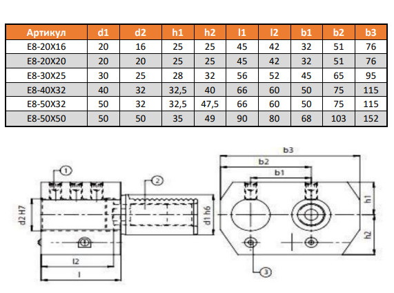 Резцедержатели тип E8 используются для фиксации резцов расточных, а так же для фиксации другого осевого инструмента, c внешней подачей СОЖ. Фиксация резца с помощью винтов в корпусе резцедержателя. При помощи переходных втулок можно расширишть возможности станка, фиксируя в держателе иснтрумент разного диаметра.